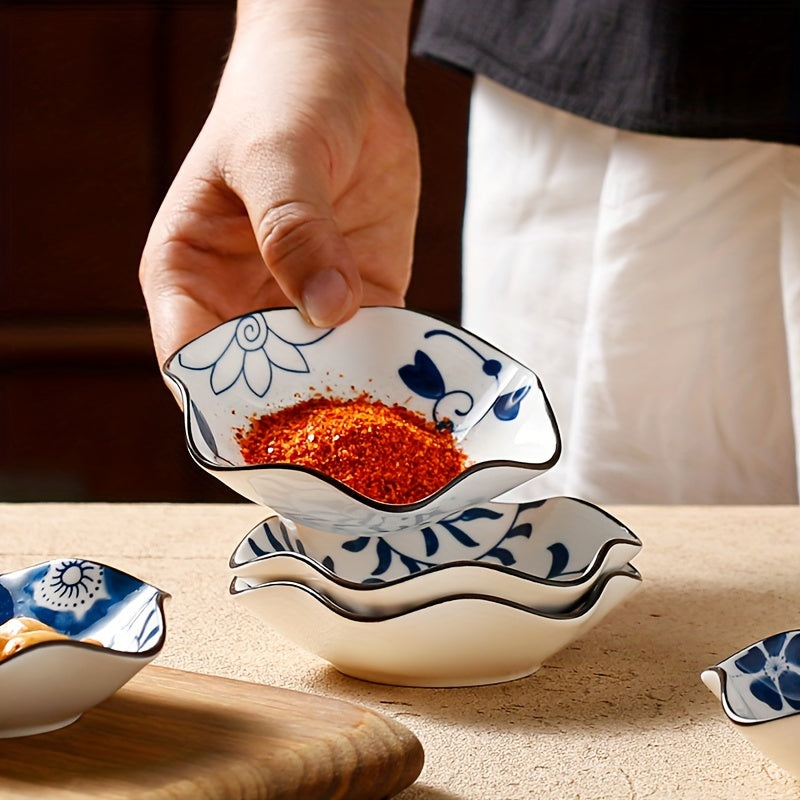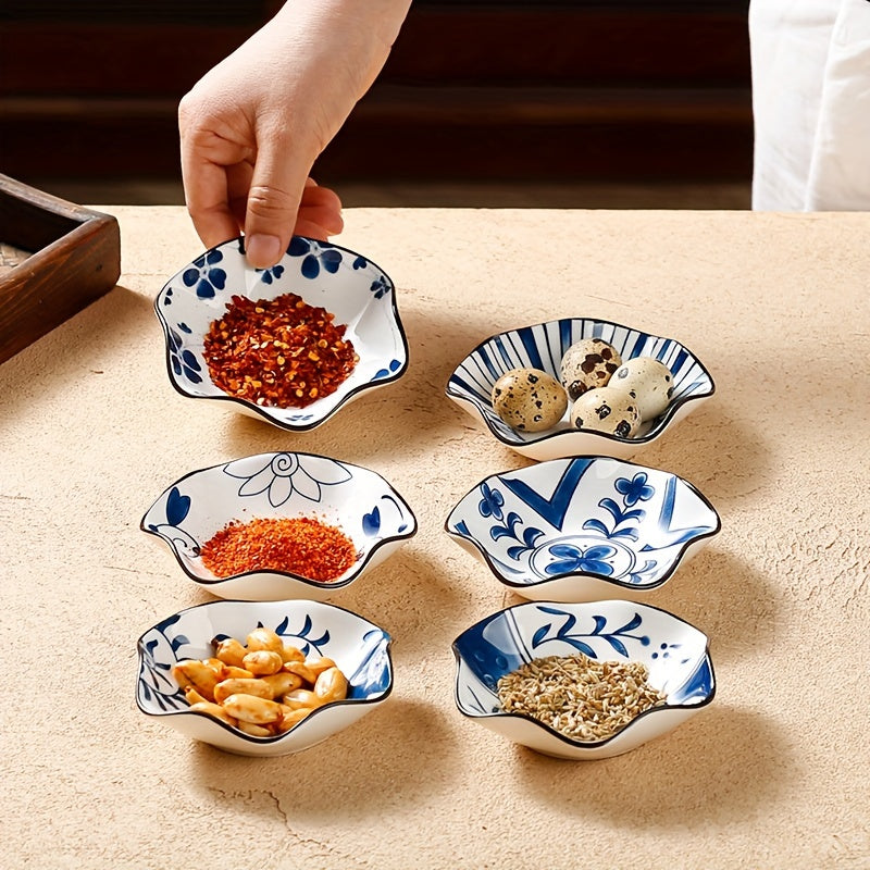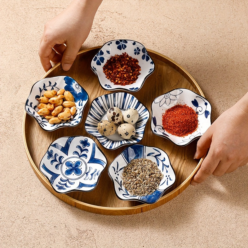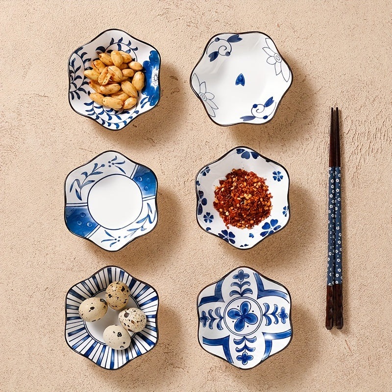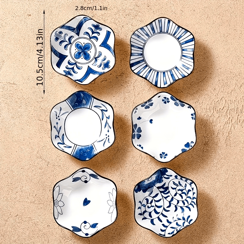6-teiliges Pflaumenblüten-Keramik-Saucenschalen-Set – Sechseckige Gewürzteller aus Porzellan, Ø 10,5 cm, Blau-weiß im traditionellen Design